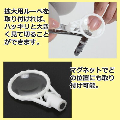 かるい力で切れる、ハンドルが大きめの爪切り!●刃の角度が自由に変えられる首振りヘッドタイプ!●倍率最大2.5倍のルーペが取り付けれてハッキリ見える!●爪切りは手の爪なら難しく感じませんが、足の爪は方向を変えないと切ることができません。